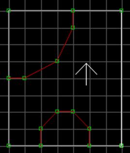Peninsular (island) sectors are similar to child sectors except that they share one or more white walls with their parent sector. Take a look at figure 8. You create a peninsula sector by starting at one vertex that is on one of the parent sector's walls and continue drawing inside the sector. To close this sector you only need to place the last vertex on another existing vertex of the parent sector. This is basically the same as splitting a sector, except that you create the splitting wall with more wall segments. You can get the same result by first splitting the sector with one wall going from one vertex to the next vertex and then inserting vertices on this wall. However it is not always possible to draw a wall inside a sector that does not cross any child sector. So it is important to know that you can make the splitting wall more complex.