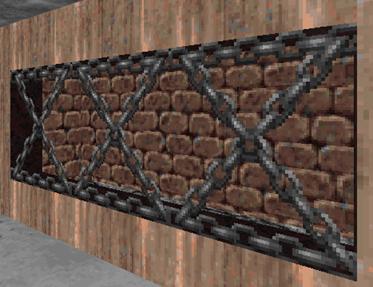 Masked walls are 2-sided walls which have a middle texture applied to it. Masked walls with no upper or lower textures look just like normal walls if all three textures are the same but you can walk through the wall if the whole is big enough for the player to pass through. This trick is often used to cover secret areas, such as wall images that are supposed to be walked through to grab some goodies there. Usually the middle texture is a partially see-through texture though like the bars in figure 10, showing a realistic looking cage. In the texture list you can determine which texture is partially see-through by watching out for purple areas in the texture. This purple color is the "see-through area" of a texture where the Build engine draws the walls, sprites, etc. Which are virtually behind the masked wall. If you apply a partially see-through texture to a single sided wall you will see the purple area because see-through textures only work correctly on 2-sided walls or as sprites.