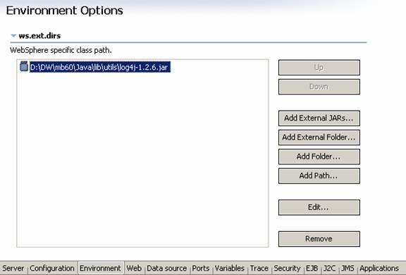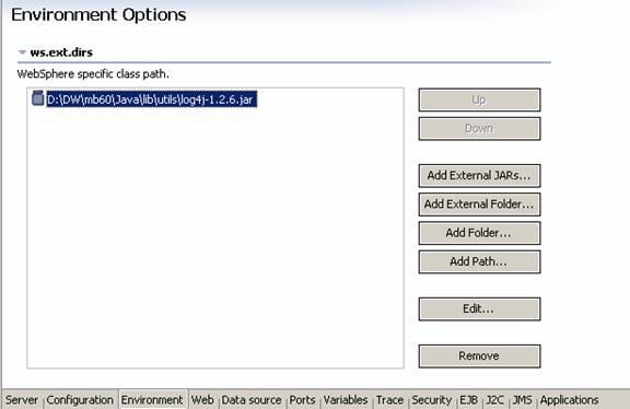 Add the log4J jar file to the Server environment: