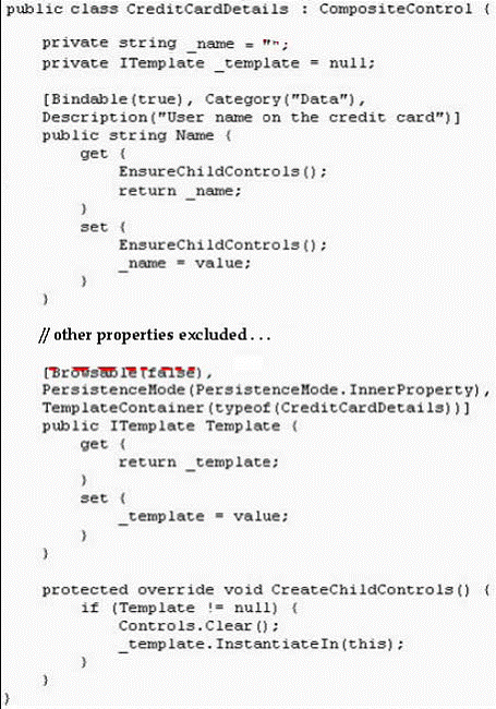 You are developing a Web application to display products. Products are displayed on different pages on your Web site. You want to create a user control to manage the display of products. You need a default visual implementation of the UI of the user control. In addition, you need to provide developers with the flexibility to change the layout and controls of the UI. Which three actions should you perform? (Each correct answer presents part of the solution. Choose three.)