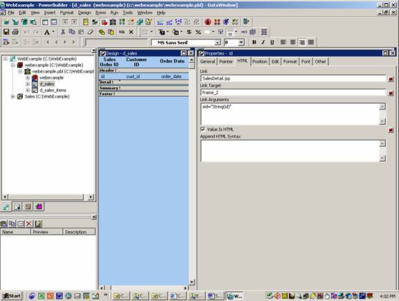 The Master/Detail report link is defined in the d_sales DataWindow. The HTML.Link,