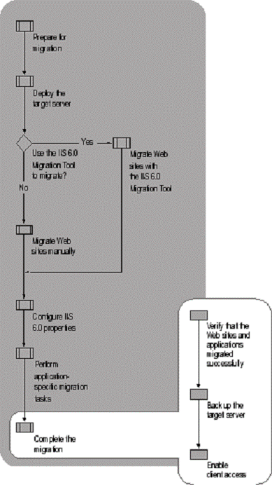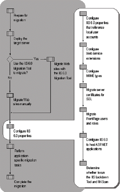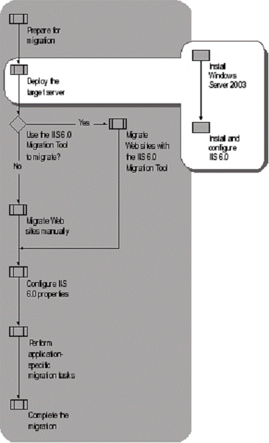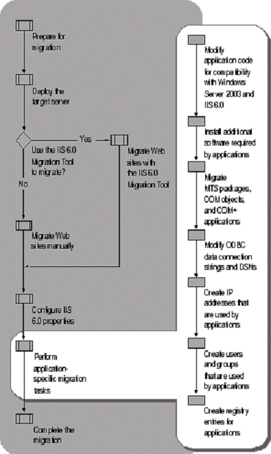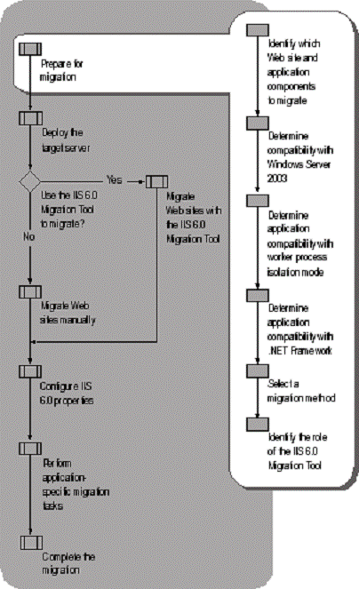You begin the migration process by determining the compatibility of your existing Web sites and applications with IIS 6.0 and the Microsoft Windows Server 2003, Standard Edition; Windows Server 2003, Enterprise Edition; Windows Server 2003, Datacenter Edition; or Windows Server 2003, Web Edition operating system. Next, you install Windows Server 2003 and IIS 6.0 on the target server, which is the server that will host your Web sites after migration. Then, you migrate the Web site content and configuration settings from the source server, which is a server running the Microsoft Windows NT Server 4.0 operating system and IIS 4.0 or the Windows 2000 Server operating system and IIS 5.0, to the target server.