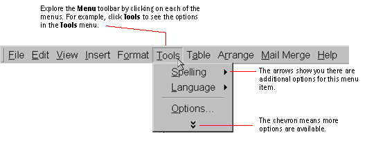 Link to the Web, create tables, insert spreadsheets, or add columns or WordArt. |