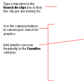 The Clip Gallery includes its own Help system, where you'll find such information as how to organize your clips in categories, how to assign keywords to clips for easy searching, and how to work with the Clip Gallery by using shortcut keys.