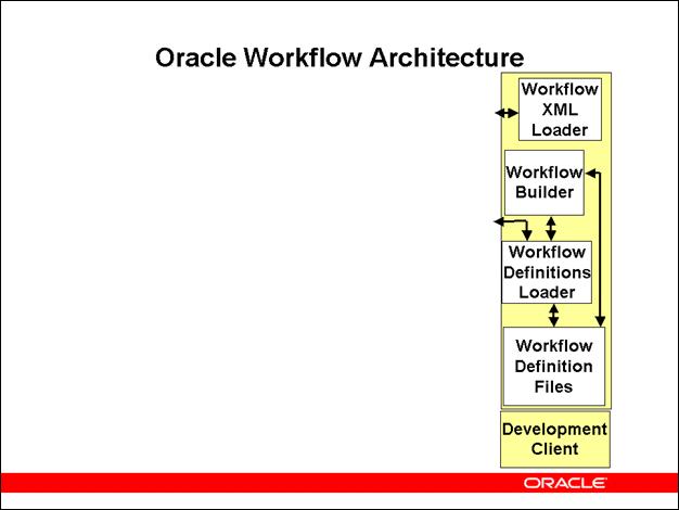 The development client is a Windows PC. This tier is used to create and modify Oracle Workflow process definitions, and to save and load flat files containing Oracle Workflow process definitions and XML definitions for Business Event System objects.