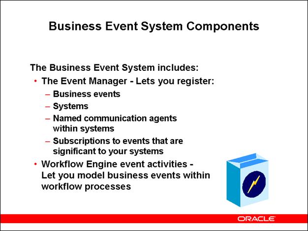 The Business Event System is an application service that communicates business events between systems. Oracle Workflow with the Business Event System can act as a system integration messaging hub that relays business event messages among systems.