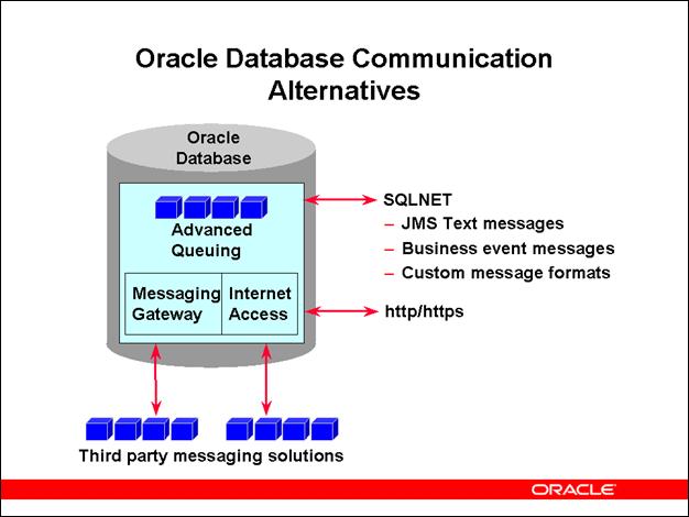 In the Oracle9i Database and higher, you can use Oracle Advanced Queuing (AQ) for communication by SQLNET, HTTP, and HTTPS protocols, and for integration with third party messaging solutions.