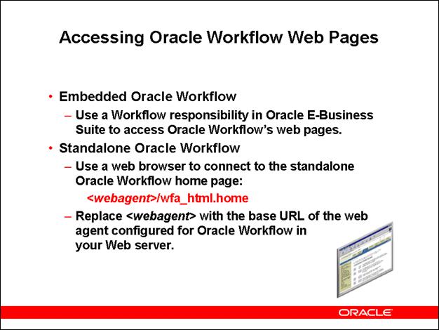 Oracle Workflow Web pages in Oracle E-Business Suite are built in the Oracle Applications Framework user interface format, while standalone Oracle Workflow Web pages are built in the PL/SQL Web Toolkit user interface format. Consequently, there are some variations between equivalent Web pages in Oracle E-Business Suite and in standalone Oracle Workflow.