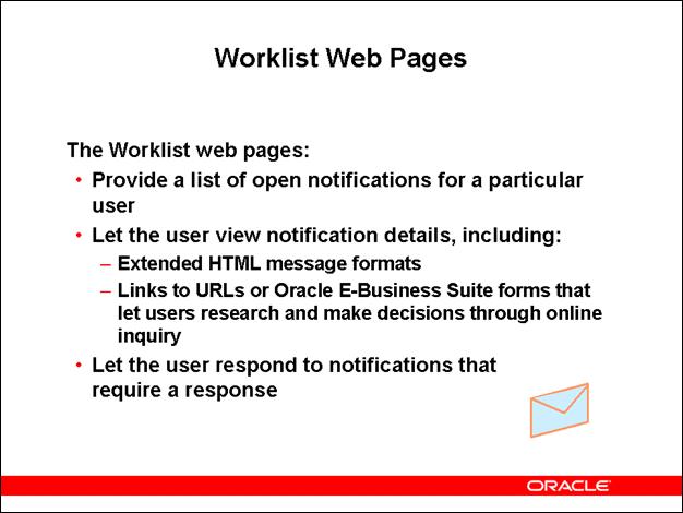The standalone version of Oracle Workflow includes the Notifications Worklist in the standalone format. The version of Oracle Workflow embedded in the Oracle E-Business Suite includes two different versions of the Worklist in the Oracle Applications Framework user interface format:
