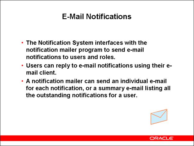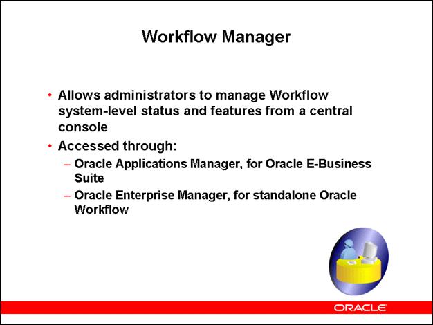 The end-user client is the workstation or PC that an end user uses to perform daily tasks. This client includes browser support for accessing Oracle Workflow Web pages, as well as for accessing the Oracle Workflow Manager component. Oracle Workflow Manager is available through Oracle Applications Manager (OAM) for the version of Oracle Workflow embedded in Oracle E-Business Suite, or through Oracle Enterprise Manager (OEM) for the standalone version of Oracle Workflow. The end-user client also includes a mail client application for reviewing and responding to notifications by e-mail.