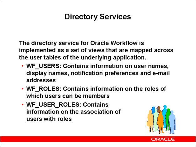 Note: In the Oracle E-Business Suite, Oracle Workflow uses a directory service model in which denormalized information is maintained in the Workflow local tables for performance gain. You should maintain synchronization between the user and role information stored in application tables by the source modules and the information stored in the Workflow local tables.
