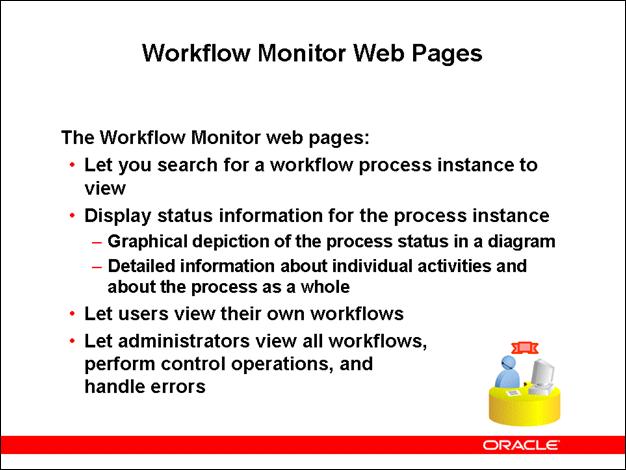 The standalone version of Oracle Workflow includes the Workflow Monitor in the standalone format. The version of Oracle Workflow embedded in the Oracle E-Business Suite includes the administrator and self-service versions of the Status Monitor in the Oracle Applications Framework user interface format.