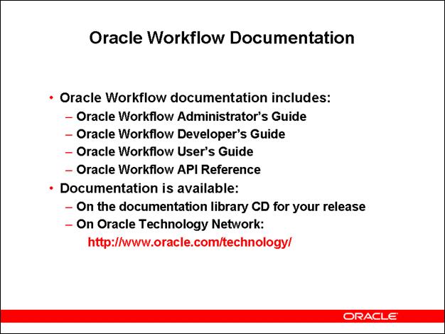 The main Oracle Workflow documentation set includes the following: