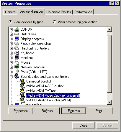 After system comes up, you will find the ¡§nVidia WDM Video Capture¡¨ listed in the System properties window. (The other WDM drivers [ like TVTUNER] is not useful with 6620 VIVO board)