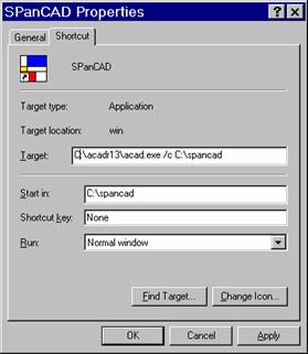 (If you are less experienced in using Windows, you might want to consult the Windows manual or on-line help to assist with creating the short cut and accessing its properties.) The /c in the middle of the second line of the dialogue box, makes AutoCAD look for the acad.ini and acad.cfg file in the folder spancad. This way your original AutoCAD configuration and settings remain unchanged when changes for SPanCAD are made.
