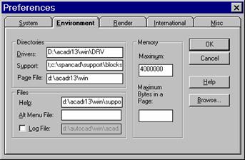 Start SPanCAD by double clicking the item you just made. If everything is OK, AutoCAD will start and a menu will be loaded. Activate the dialogue box with preferences from the menu (Options; Preferences; Environment) or by typing preferences on the command line. The figure on the next page, displays the preferences dialogue box. Add, to the line named Support, the following paths ;C:\spancad\support;C:\spancad\support\blocks .