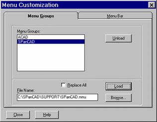 Now you can add the SPanCAD commands to your pull-down menu: Choose from the menu (Tools; Customise Menus) or type menuload on the command line. and the following dialogue box will appear.