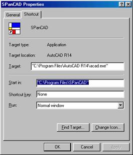 Create an extra short cut for AutoCAD. Change the properties of the short cut as displayed in the figure below: Change the second line to "C:\Program Files\ SPanCAD" . The official SPanCAD icon can be found in the folder SPanCAD.