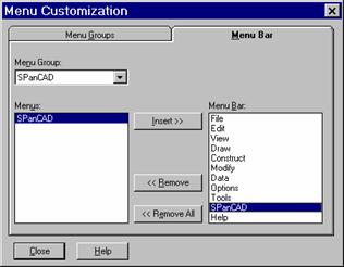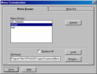 Use the Browse button to select the file spancad.mnu in the folder spancad\support. Press the Load button to add this file to the menu groups. Go to the folder Menu Bar and select the item SPanCAD from the menu Groups. Add the menu SPanCAD to your menu by pressing the Insert button as the figure below shows.