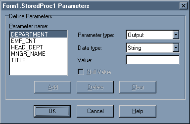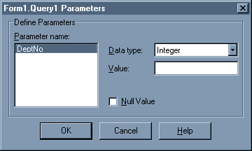 When you want to test or set a default value for the parameter, select the Params property of Query1. Click the '...' button. This presents the parameters dialog. Select the parameter DeptNo. Then select Integer from the data type drop-down list. To set a default, make an entry in the Value edit box.