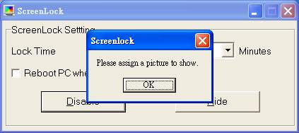 When user run the ScreenLock program at first time, this application will load a default bitmap file (The file name is picScreenSaver.jpg) to be the displayed picture on the ¡§system lock¡¨ situation. If the user want to show other picture, you have to close this application first, then delete the picScreenSaver.jpg file from the application¡¦s folder, then start this application again. After doing this, every time you start this program, it will ask you to choose a picture for it!!