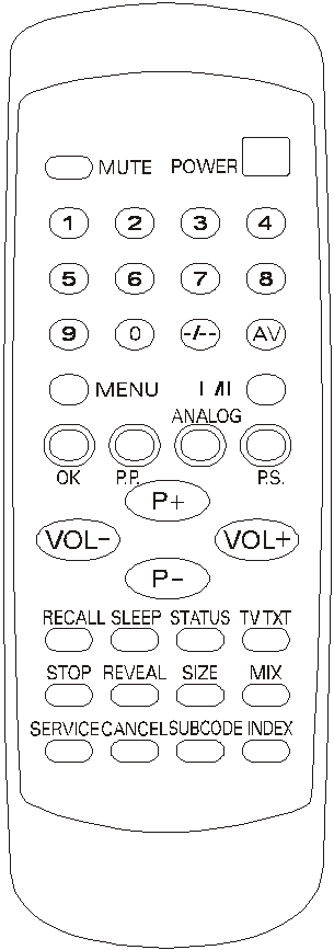 To enter the service mode, a special remote control which contains an additional SERVICE key must be used. See the illustration. Press the SERVICE key on remote control, TV will display service menu as following table 1 line by line. To select the parameter by using the P+/P- keys. To adjust the selected parameter by using the V+/V- keys. To quit the service mode, press the P.P. key on remote control when in the service mode.