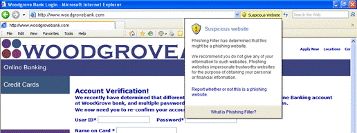 Microsoft Phishing Filter Phishing and other malicious activities thrive on lack of communication and limited sharing of information. To effectively provide anti-phishing warning systems and protection, Microsoft's new Phishing Filter in Internet Explorer 7 consolidates (via an online service that is updated several times an hour) the latest industry information about the ever-growing number of fraudulent Web sites spawned every day. It then feeds that information back to proactively warn and help protect Internet Explorer 7 customers. The filter is designed around the principle that to be an effective early warning system, it must ensure information is derived dynamically and updated frequently. Phishing Filter is available now in Internet Explorer 7 beta 1 for Windows XP and also will be part of the Windows Vista beta 2 release.