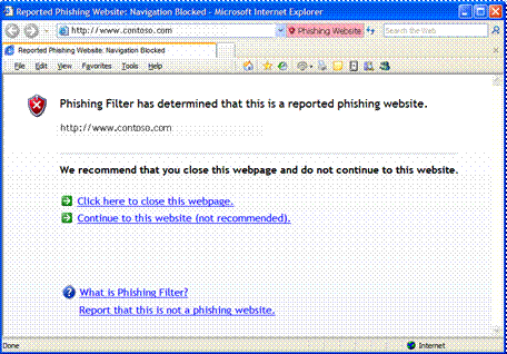If the Web destination has been confirmed as a known phishing site, Internet Explorer 7 signifies the threat level (in red) and automatically navigates the user away from that site.