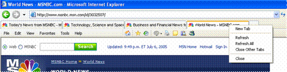 Tabbed browsing offers users the ability to view more information across different sites with less effort as well as quickly skim multiple pages without the cumbersome process of managing multiple browser windows. To create or open tabs in Internet Explorer 7 beta 1, users can click on the empty tab on the toolbar or right-click on any hyperlink in a Web page and choose New Tab. They also can right-click on a tab to refresh each page as an individual tab or refresh all of them as a group, as well as close individual tabs or the entire group. There are many more tab-related advances to come in the final release of Internet Explorer 7, both in terms of user interface design and flexibility.