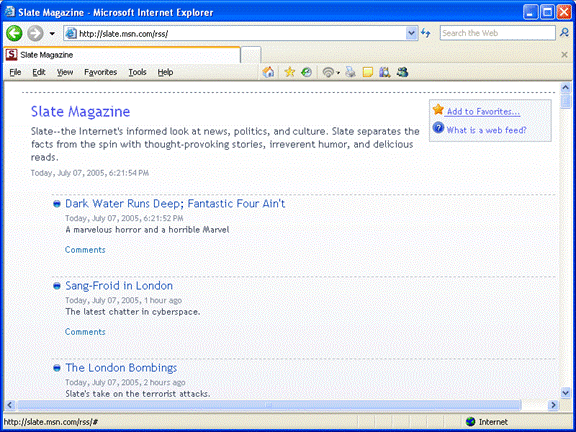 Basic viewing and subscription. Today, RSS feeds are rendered in the browser in raw Extensible Markup Language (XML), which is unreadable by anyone but the most technical users. In beta 1, users will be able to view the feed directly in the browser, scan for important stories and get a description of the content. Users also will be able to subscribe to a feed by adding it to their Favorites list with a single-click that feels very similar to adding a favorite Web site. In the final version of Internet Explorer 7, the browser will automatically notify a user when updates have been added to a feed.