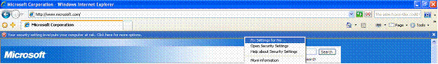 Knowing that most users are likely to install and operate applications using the default configuration, Internet Explorer 7 ships with security settings designed to provide the maximum level of usability while maintaining controlled security. There are legitimate reasons why a custom application may require a user to lower security settings from a default, but it is critical the user reverse those changes when they are no longer needed. Internet Explorer 7 introduces users to the new Fix My Settings feature to keep users protected from browsing with unsafe settings. This new feature in Internet Explorer 7 warns users with an Information Bar when current security settings may put them at risk. When a user makes changes in the security settings window, they will see settings automatically highlight in red if they modify certain critical items. In addition to dialog alerts warning the user about unsafe settings, the user will be reminded by the Information Bar as long as the settings remain unsafe. Users can instantly reset the security settings to the 'Medium-High' default level by clicking the 'Fix My Settings' option in the Information Bar.