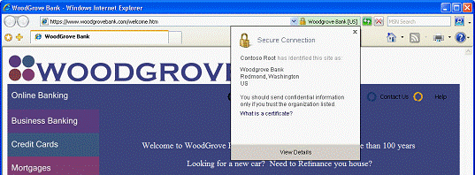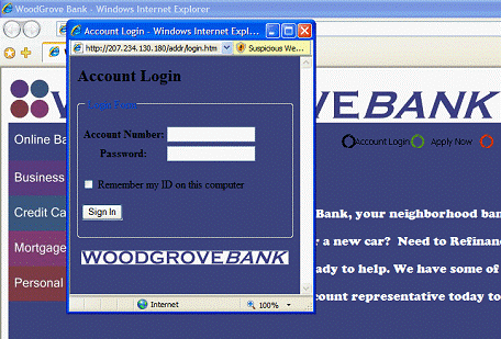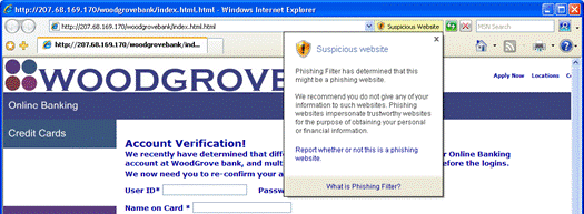 Internet Explorer 7 uses the Security Status Bar to signal users (in yellow) if a Web site is suspicious. The example below shows a site that is attempting to spoof a legitimate Woodgrove Bank site.