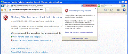 If the Web destination has been confirmed as a known phishing site, Internet Explorer 7 signifies the threat level (in red) and automatically navigates the user away from that site.