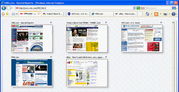 Internet Explorer 7 helps manage multiple tabs with a feature called Quick Tabs. Quick Tabs enables users to view thumbnail images of all open tabs in one view. By simply clicking the Quick Tab icon just to the right of the Favorites icon, users can view all open tabs. From the Quick Tabs view, the user can open any tab by simply clicking anywhere on the tab image and can close any tab by clicking the "X" in the far right corner of the image. The Quick Tabs page will scale to the number of tabs the user has open. If a user has nine tabs open, Quick Tabs will preview thumbnail images of all nine tabs; if a user has more than 20 tabs open (not recommended), they will see smaller thumbnail images of each tab but will still be able to see all tabs in single view.