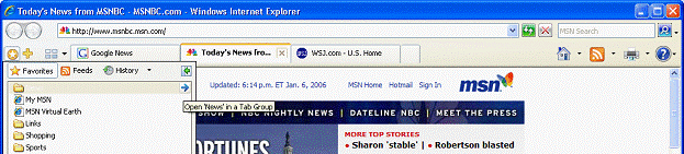 Tabbed browsing is the most-requested browser navigation feature among customers seeking to manage multiple Web sites within one browsing window. To create or open tabs in Internet Explorer 7, users can click on the empty tab on the Toolbar or right-click on any hyperlink in a Web page and choose New Tab. They also can right-click on a tab to refresh each page as an individual tab or refresh all of them as a group, as well as close individual tabs or the entire group.