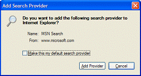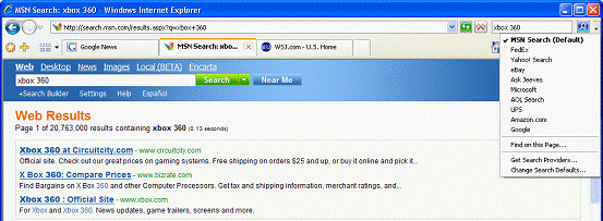 When users upgrade to Internet Explorer 7, the Toolbar Search Box will inherit the default setting the user had chosen for AutoSearch in Internet Explorer 6. To offer users the greatest choice, Internet Explorer expands the definition of search provider by including broad and vertical search providers as potential candidates in the Toolbar Search Box drop-down list. From the Toolbar Search Box drop-down menu the user can simply click on Get Search Providers to be linked to the Windows Search Guide. This guide includes many broad and vertical search providers that can be added to the Toolbar Search Box with a single click.