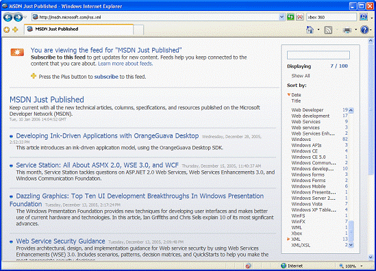 In previous versions of Internet Explorer, RSS feeds were rendered in the browser in raw Extensible Markup Language (XML), which is unreadable by anyone but the most technical users. In Internet Explorer 7, users can read the feed directly in the browser, scan for important stories and get a description of the content. Users can also subscribe to a feed with a single click, a process that is very similar to adding a Web site Favorite.