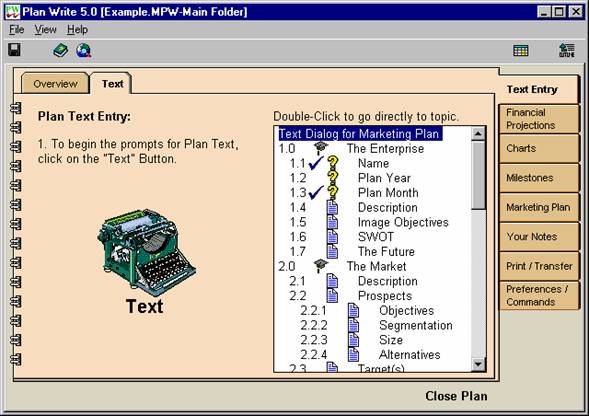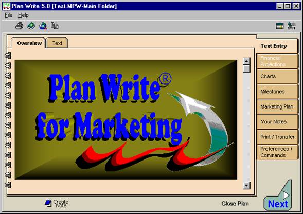 The Plan Write user interface is in the form of a set of folders that can be opened by clicking on the folder tab. The display shown above is called the "Main Folder". Within the main folder are eight primary folders whose tabs are positioned down the right side of the display. Each primary folder has two or more sub-folders whose tabs are positioned across the top of the display. The first sub-folder is always an overview of the primary folder's purpose. The screen shot above shows the Overview sub-folder within the Text Entry folder. The overview explains that the Text Entry folder describes the concepts you must address as you document your marketing plan. The other primary folders are: