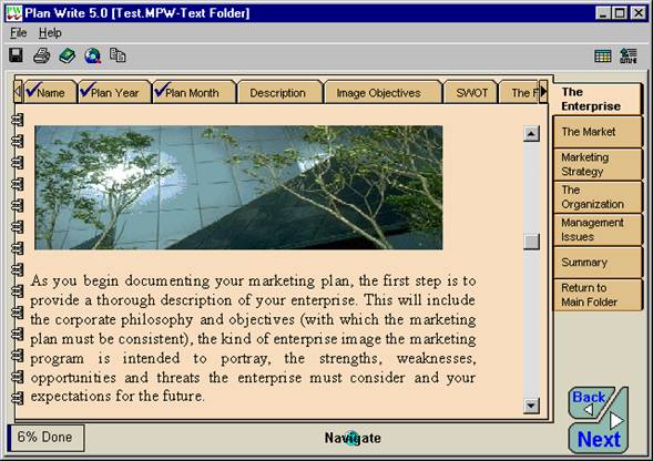 An outline of the concepts you will be addressing is displayed with the Using Plan Write topic highlighted. Clicking on the Text button (the typewriter) will display the topic that is highlighted, in this case The Enterprise. You can also double click on any topic label in the outline to go directly to that concept. Clicking on the Text button will result in the following display.