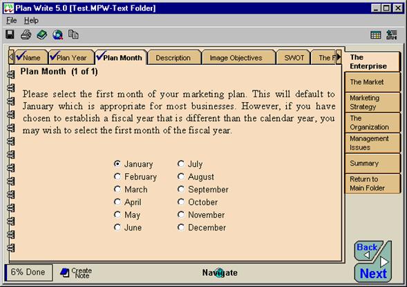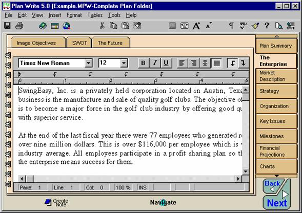 Notice that there are several buttons. Clicking on the Introduction button will step you through a brief explanation of the various features of Plan Write . The Open the Example button will open a sample plan of a fictitious golf club manufacturer. The Create a New Plan button will be used each time you want to begin a new plan. The Open Your Last Plan button will open the last plan you were working on. The Open an Existing Plan button will allow you to choose a specific plan for review.