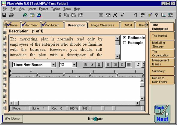 The rationale, shown at the top part of your window, explains why this topic should be included in your plan and offers suggestions for content. To see the text of the plan example, click on the Example button to the right of the rationale window and the rationale will be replaced by the example. To return to the rationale click on the Rationale button.