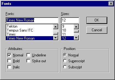 For your text characters, Plan Write allows specification of the font type and size as well as special effects such as bold and underlining. To set these characteristics, select the desired portion of the text and then choose the Character... command from the Format menu. This will display the following dialog box. Select each of the desired characteristics and click the OK button. The selected text will take on the specified characteristics.