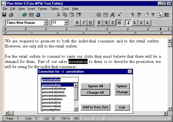Plan Write gives you the ability to check the spelling in your plan at any time. To check the spelling in the text of a specific topic, display the desired topic from the Review Document outline of the Marketing Plan folder and choose the Spell Checker... command from the Tools menu or click the spell checker button from the button bar.