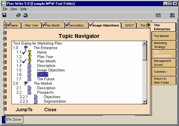 An outline of all of the topics in the folder is available to scroll through. Use the up and down arrow keys or the scroll bar to locate the desired topic and, with the topic highlighted, click on the JumpTo button or double click on the topic label. If you want to return to the topic you started with click on the Close button.