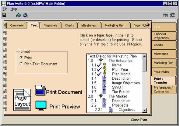 When you are ready to print your plan, choose the Print Document tab in the Marketing Plan folder.