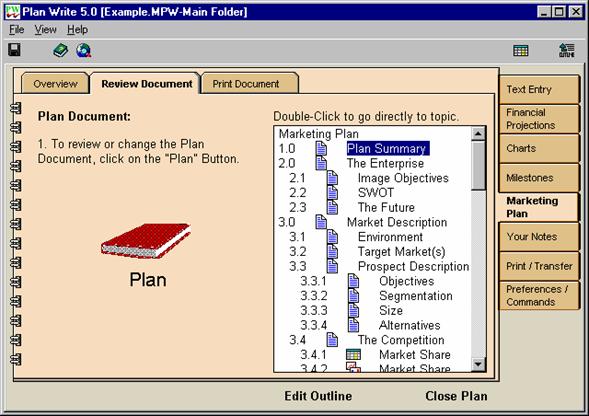 After going through the dialog answering the questions and entering the text you will want to see how the finished plan will look. That is what the Marketing Plan folder is designed for. When you choose the Review Document tab an outline of your plan will be displayed (the Plan Summary will be highlighted the first time). The plan is ordered in a way that is appropriate for reading by managers, bankers or investors. To begin the review just click on the Plan button on the left.
