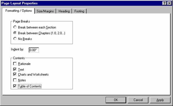 This dialog box will allow you to specify page breaks and which portions of the data content you wish to be printed (the default is the text, charts, worksheets and a table of contents). In addition you can establish paper size and print margins, customize headers and footers and specify page-numbering criteria.