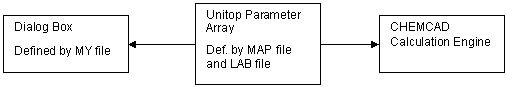 As you can see data transfer goes in both directions, meaning that calculated results for a unit are passed to the dialog in the same way that data is passed from the dialog into CHEMCAD. The Unitop Parameter Array performs any data conversions necessary, so that you might enter a value of 100 degrees Fahrenheit in a dialog, but the program sees a value of 559.67 degrees Rankine.