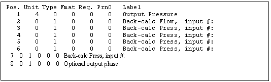 The next 8 lines define the members of the array. The first line describes a variable "OPRESS", which is the first element in the array, a floating-point double precision number, and it has units of pressure. A complete list of units is given in Appendix A. The second line describes a variable "FRSTRM", the second element in the array; it is a floating-point long integer type, with no engineering units. All of this will be described at greater length later. For now, just accept that this file defines an array of 8 numbers, the first of which is a floating-point number in the units of pressure.