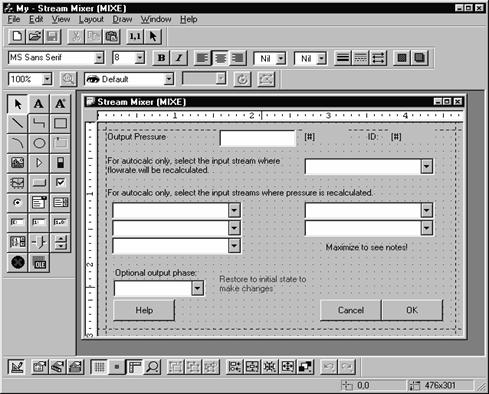 In this manual, we will get started with an example from CHEMCAD, the mixer dialog box. Then we will get started building a unitop parameter array for a very simple dialog. We will introduce you to the various objects in a dialog box, and give some overall design guidelines. We will then discuss more complex topics of screen editing, such as VB scripting.